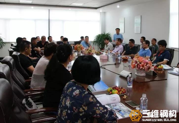 三維鋼構領導與玫德集團考察團齊聚會議室內,暢聊企業發展,會議由內貿部張經理主持。