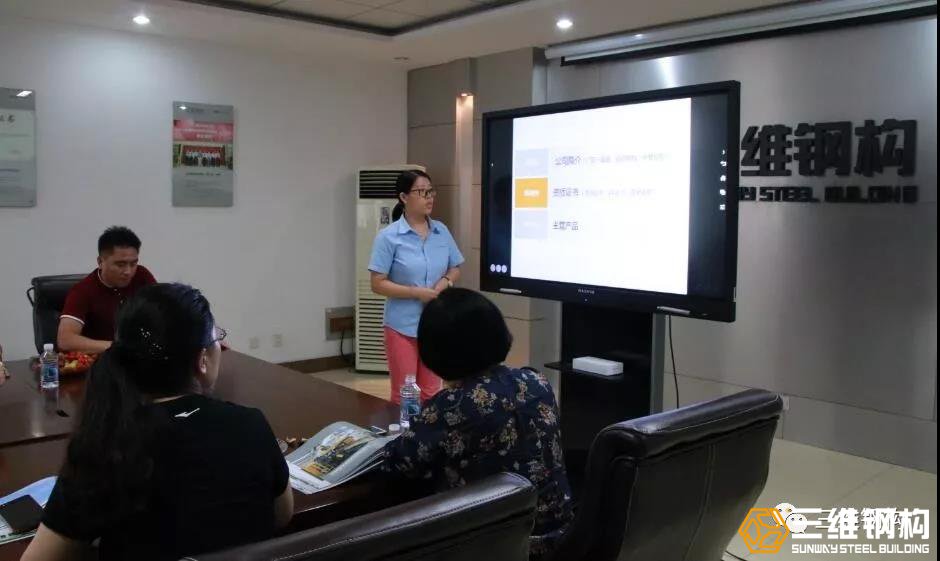 三維鋼構外貿部李經理就三維鋼構產品與資質等方面進行了比較詳細的介紹,讓來訪貴賓對三維鋼構有了更深入的了解。