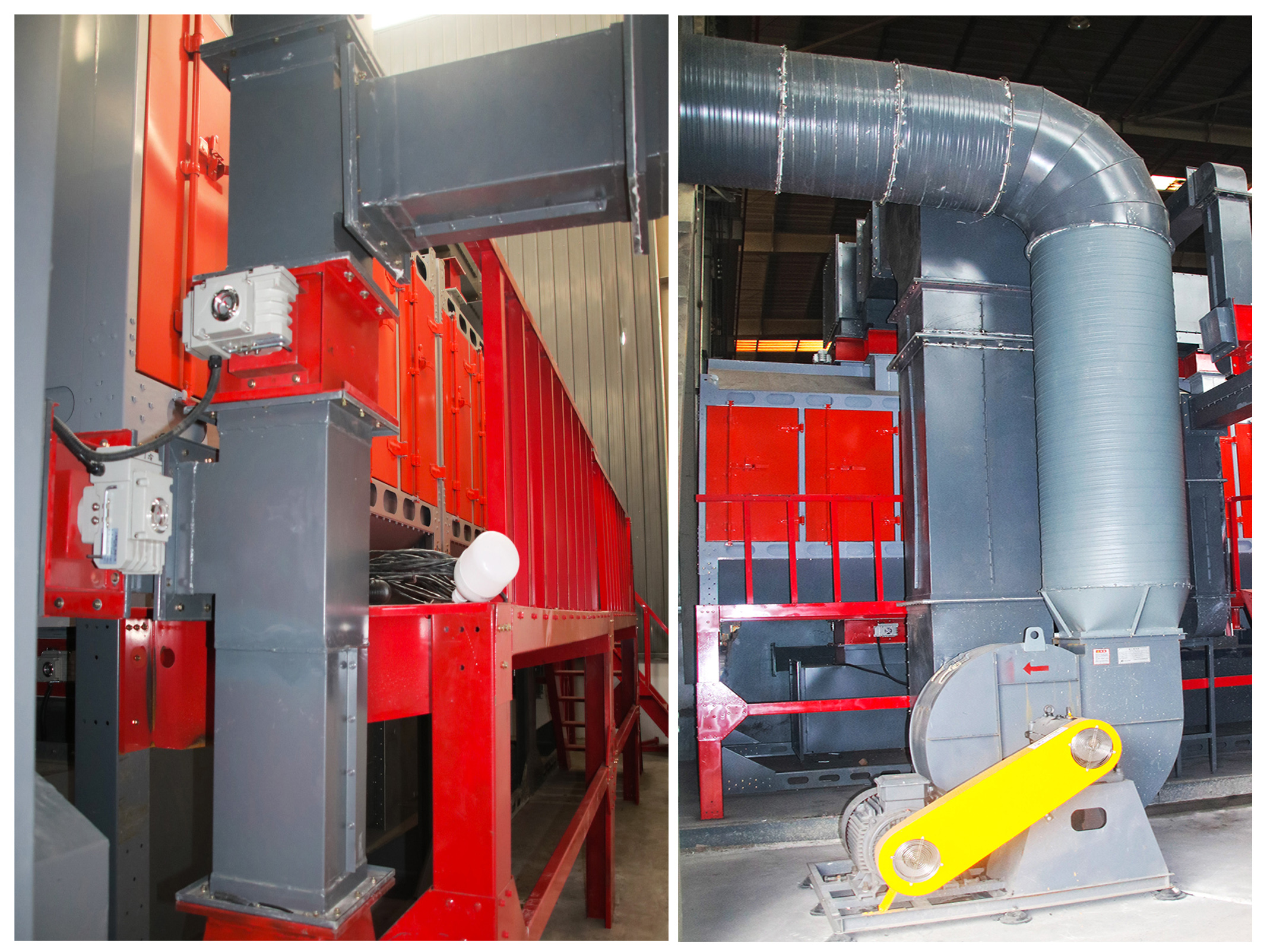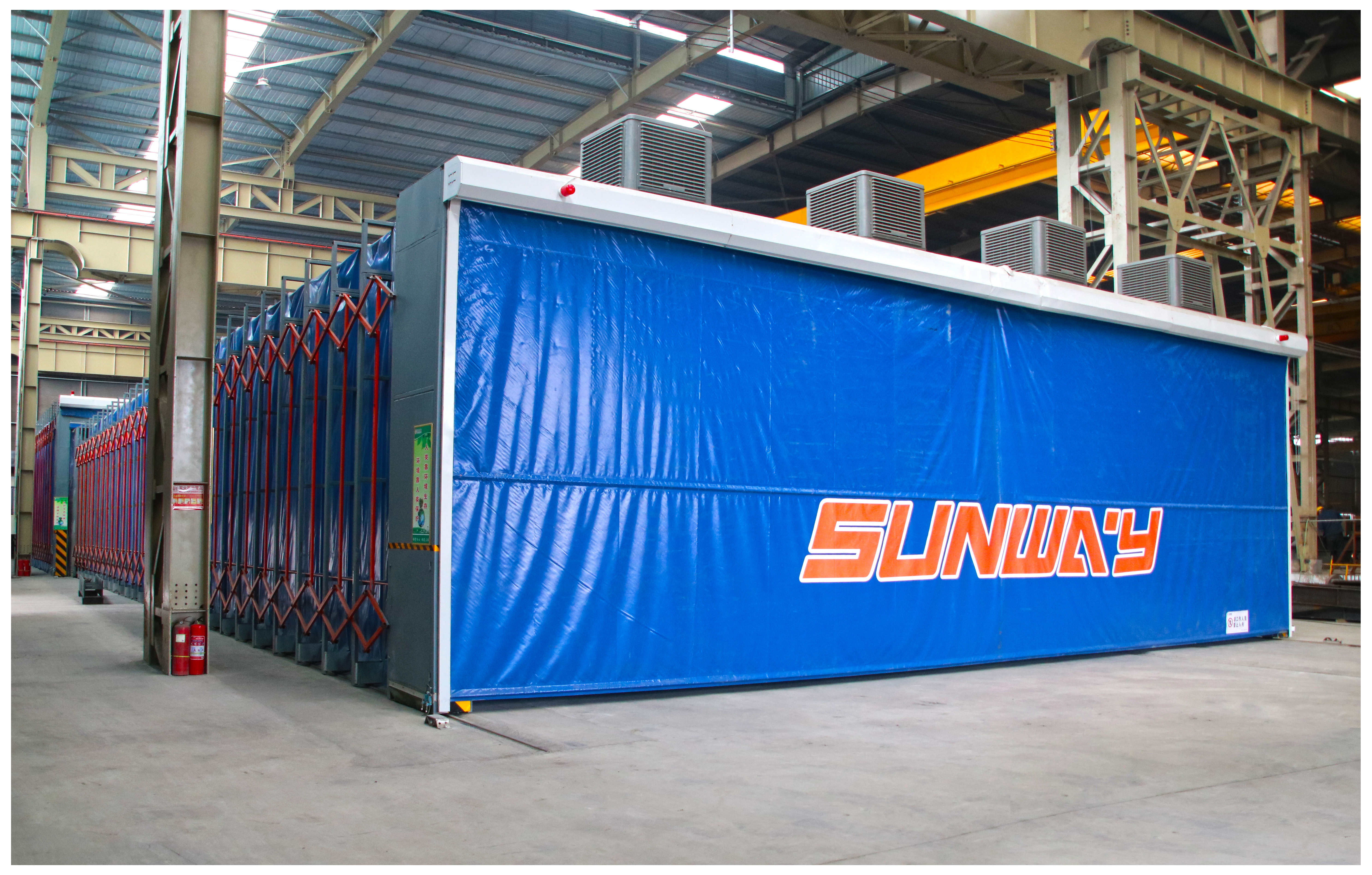 原來這個50米長的裝備學名為“伸縮式干式噴霧處理噴漆庫房”,它主要由軌道、移動框架室體、照明系統、干式漆霧處理箱和電控系統組成。采用“兩級過濾+活性碳吸附+濃縮+催化燃燒”的工作原理,通過催化燃燒過程,借助于催化劑的吸附作用,使有機廢氣產生無焰燃燒,并氧化分解為CO2和H2O,同時釋放出大量熱能,從而去除廢氣中有害物質,凈化成潔凈氣體由主排風機排入大氣中,達到降能環保功效。